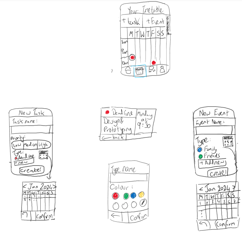 The following images showcase the interface design ideas that I created for an assignment during my third year of university. I was asked to brainstorm and prototype an idea for an app, which would help a target audience with various struggles. For my idea, I decided to go with prototyping a timetabling application for university students who struggle with time management skills.